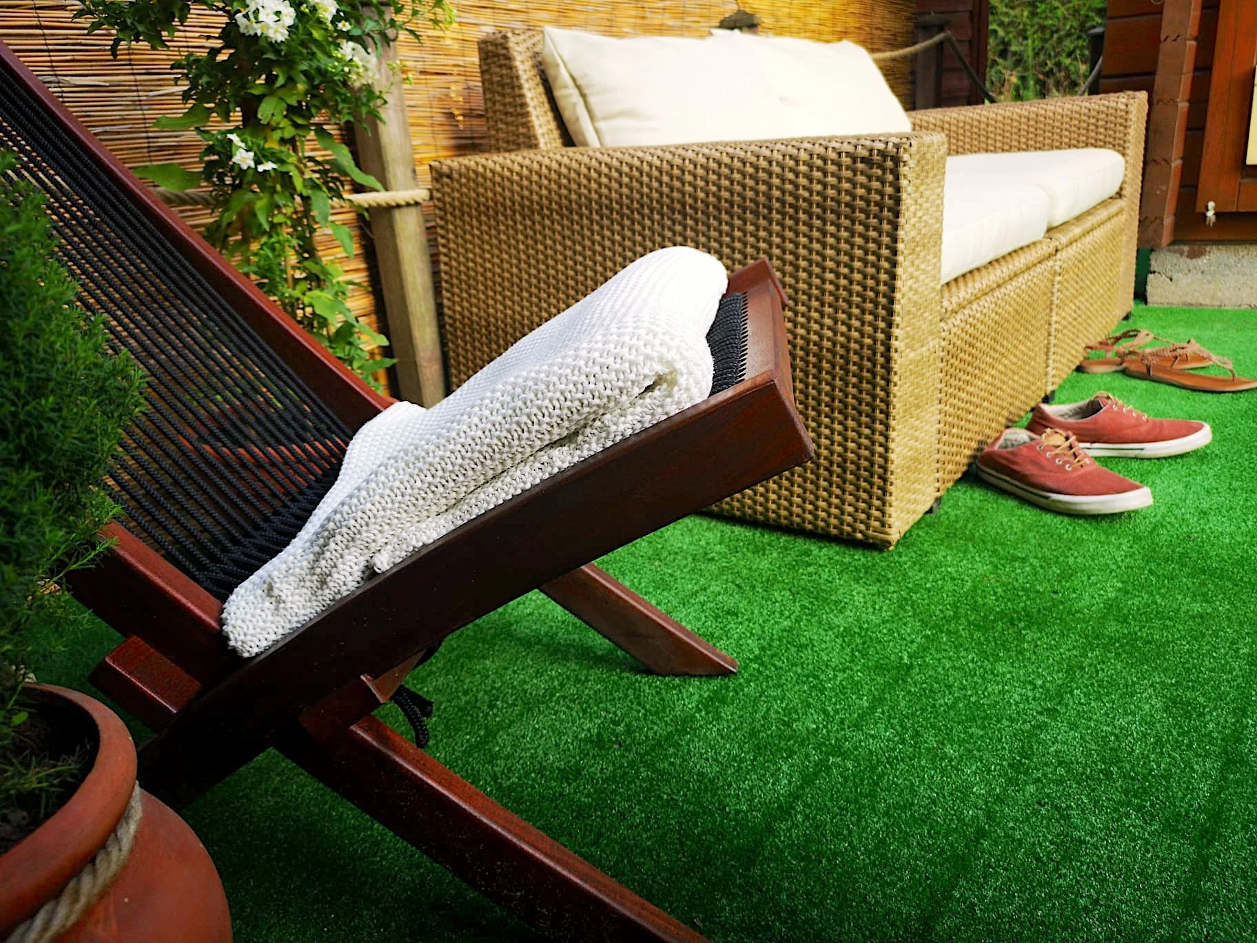 Terrasse, Rattan-Möbel, Singvögel und Blumen